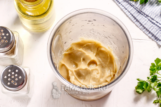 Запеченные яблоки очистите от кожуры. Удалите семенные блоки, а мякоть выложите в чашу блендера. Если яблоки сладких сортов, то влейте 1 ч.л. яблочного уксуса, чтобы соус не получился сладким на вкус. Всыпьте соль и молотый черный перец, влейте растительное масло без аромата и пюрируйте все примерно 2-3 минуты.
