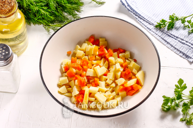 Нарежьте картофель и морковь мелкими кубиками и высыпьте нарезки в глубокую емкость.
