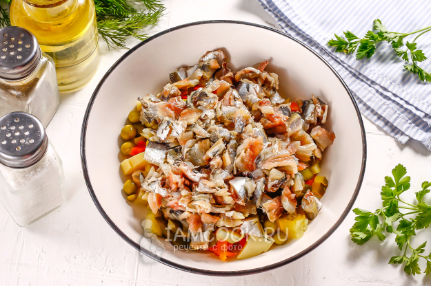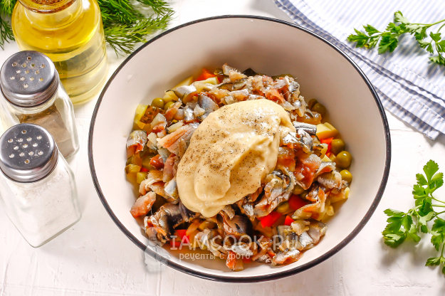 Выложите яблочный майонез в салатник, посолите и поперчите. Аккуратно все перемешайте и поместите постный Оливье с килькой пряного посола в холодильник на 1 час.