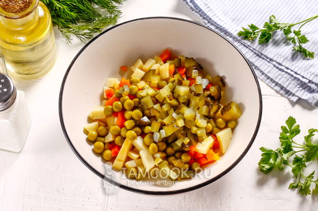 Такими же кубиками нарежьте соленые огурцы и дайте выделиться рассолу из нарезки примерно 5-7 минут. В это время процедите консервированный горошек от маринада. Добавьте и горошек, и нарезку соленых огурцов в емкость.