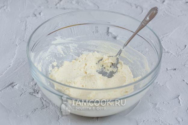 В несколько приемов введите яичную смесь в манно-сметанную.