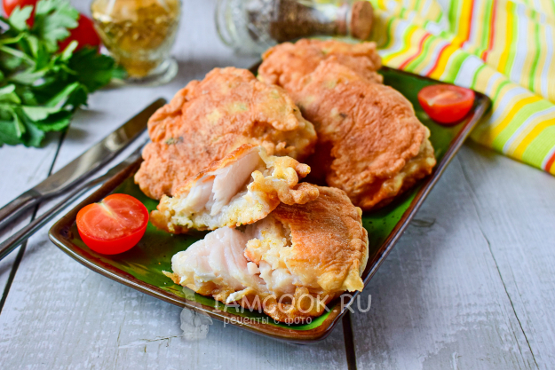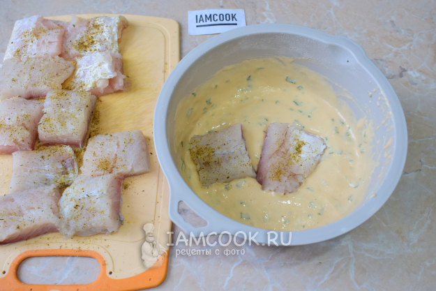 Каждый кусочек рыбки окуните в кляр, чтобы он равномерно её покрыл со всех сторон.