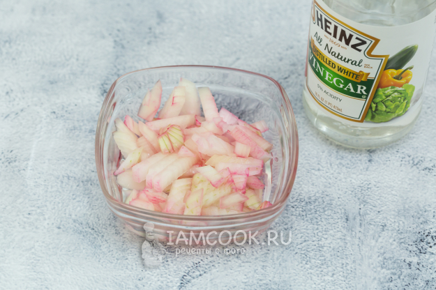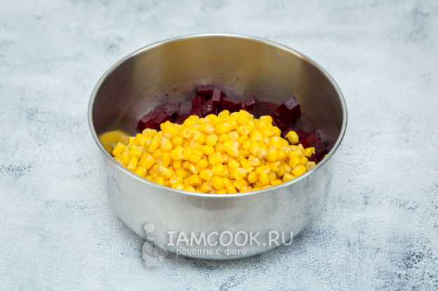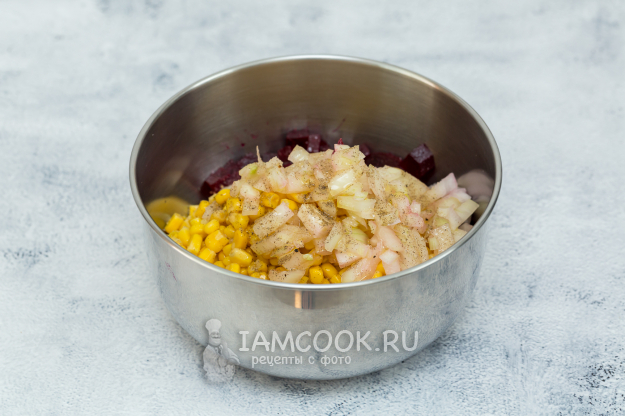Из емкости с луком слейте уксус, а лук добавьте к кукурузе и свекле.