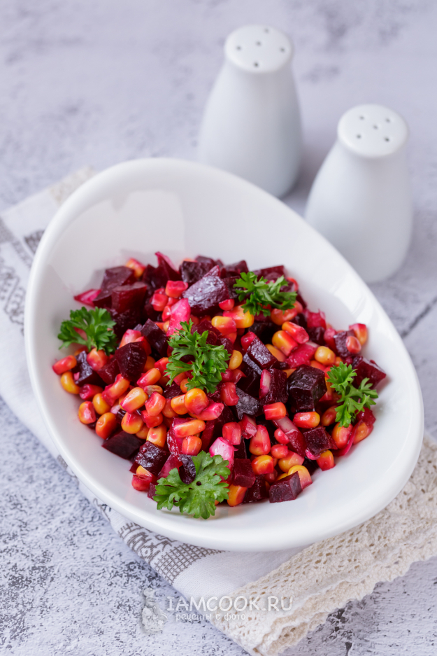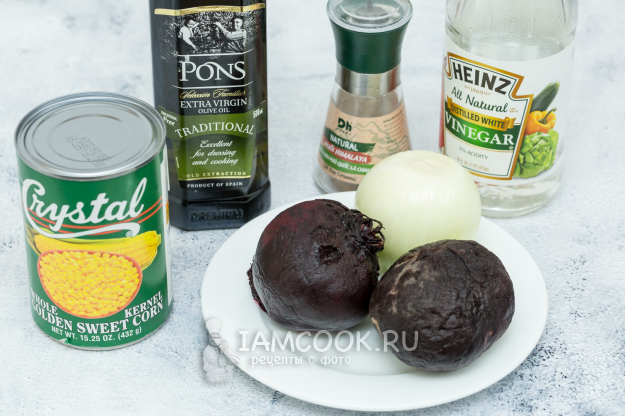 Для приготовления салата из свеклы с кукурузой и луком подготовьте продукты по списку.