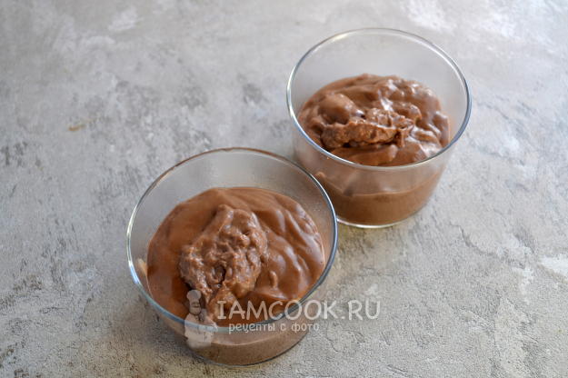 Сразу же горячий пудинг разлейте в стаканчики. Шоколадный пудинг ПП очень быстро густеет и застывает. Готовый пудинг охладите.