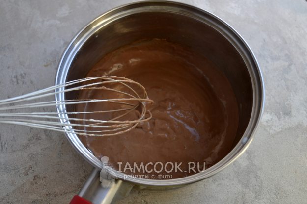 Нагрейте остальное молоко и сахар в сотейнике почти до кипения. Влейте в сотейник размешанный крахмал с какао-порошком. Сразу же венчиком перемешайте массу, чтобы не было комочков.
