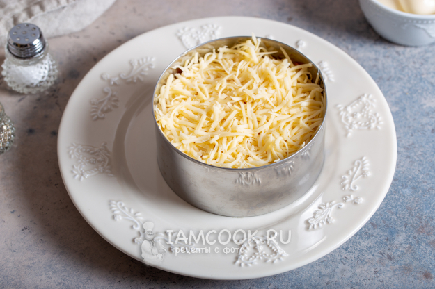 Сыр натрите на средней или мелкой тёрке. Выложите в салат и промажьте небольшим количеством майонеза.