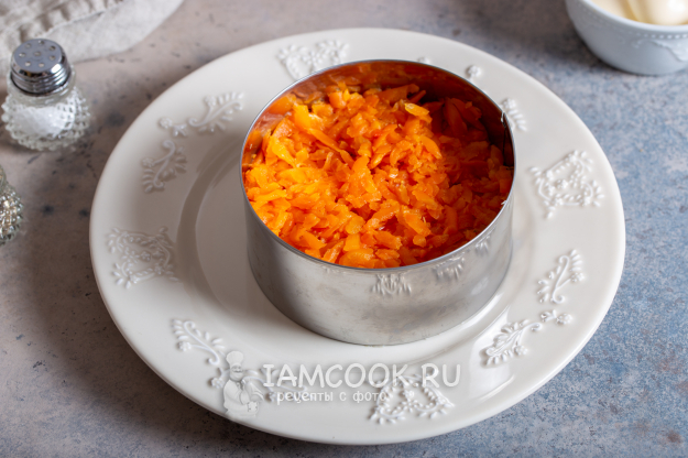 Морковь очистите и натрите на крупной тёрке, выложите в салатник и промажьте слой небольшим количеством майонеза.