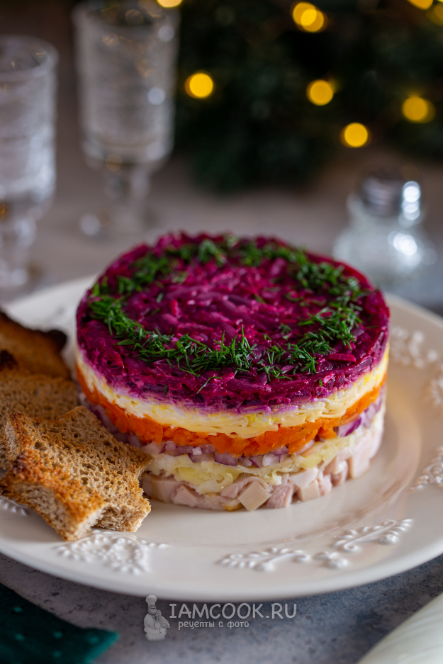 Перед подачей на стол дайте салату с копченой курицей и свеклой немного охладиться. Затем украсьте его по своему вкусу и подавайте на стол. Приятного аппетита!
