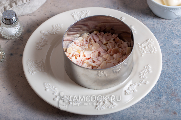 Промажьте слой небольшим количеством майонеза или сделайте майонезную сеточку.