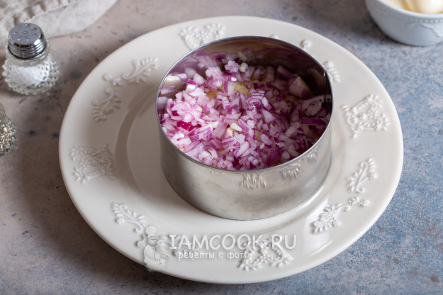 Красный лук очистите и мелко нарежьте. Выложите следующим слоем.