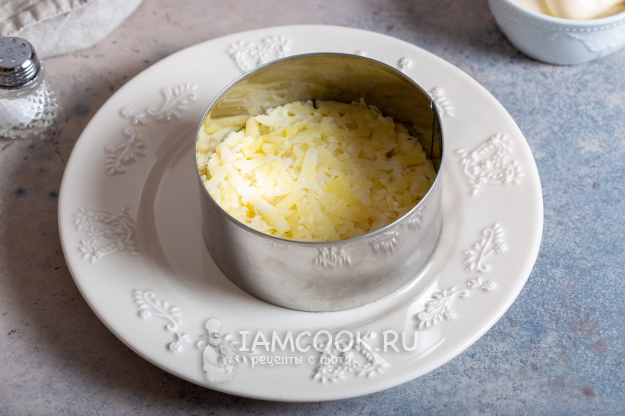 Картофель очистите от шкурки и натрите на крупной тёрке. Выложите следующим слоем в салат и промажьте майонезом.