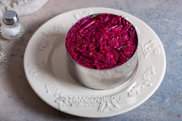 Свеклу очистите от шкурки, натрите на крупной тёрке. Добавьте измельчённый чеснок и немного майонеза, перемешайте. Выложите последним слоем в салат.