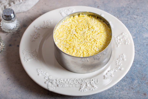 Яйца очистите и натрите на мелкой тёрке. Смешайте с небольшим количеством майонеза и выложите следующим слоем.