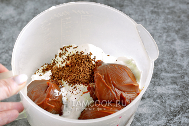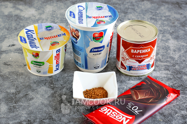 Пока бисквит остывает, приготовьте крем. Для этого возьмите все по списку ингредиентов. Каймак легко заменяется другими продуктами, о которых я написала в советах. Если не любите кофе, то не добавляйте его в крем.