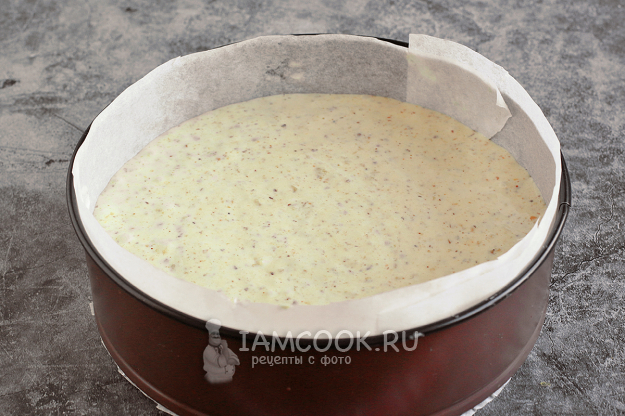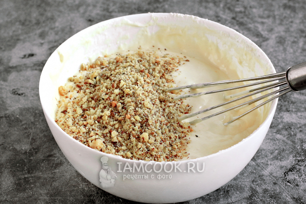 Добавьте частями просеянную с разрыхлителем муку, а потом - орехи. Каждый раз аккуратно размешивайте все венчиком вручную. Пройдитесь по дну миски, там часто скапливается непромешанная мука. Делайте все аккуратно и недолго, чтобы тесто не осело.