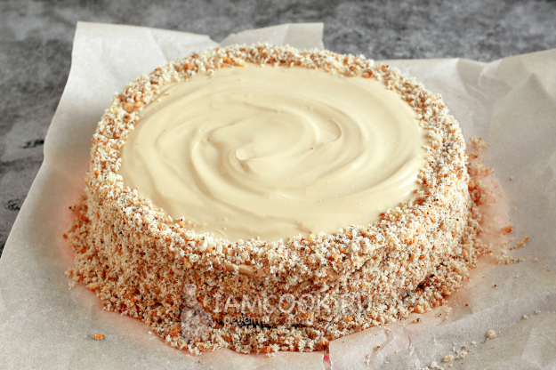 Последним слоем должен быть крем. Поставьте торт в морозилку на 20 минут для полного охлаждения.