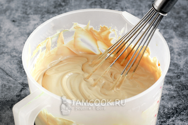 Затем частями добавляйте сахар и продолжайте взбивать до получения плотной, глянцевой белковой массы. При переворачивании миски белки не выливаются. По одному добавляйте желтки и снова взбивайте. Не затягивайте этот процесс - как только желток растворился, сразу добавляйте следующий.