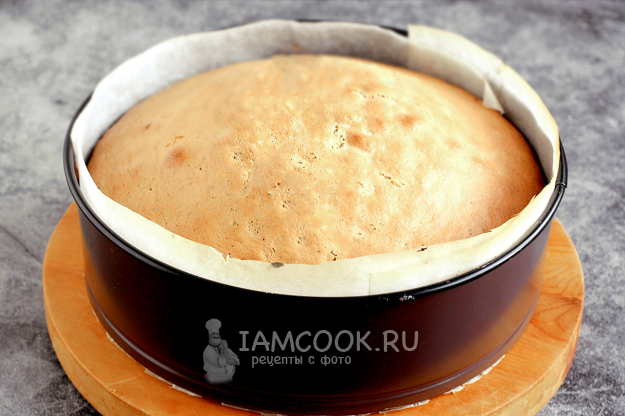 Полученное тесто вылейте в форму, выстланную силиконовым пергаментом. Если пергамента нет, то немного смажьте дно сливочным маслом, а бока ничем не смазывайте. Можно бока формы также выстлать полосками пергамента, прикрепив его каплями теста. Поставьте бисквит в разогретую до 180 градусов духовку, а через 15 минут снизьте температуру до 160 градусов, и выпекайте всего 40-45 минут. Духовку первые 20 минут не открывайте. Если бисквит начнет сильно румяниться, то положите сверху кусочек фольги. Если будет подгорать низ, то поставьте еще один дополнительный противень.