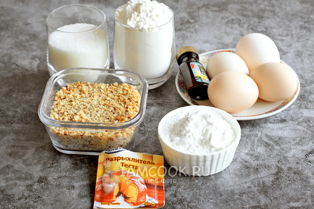Чтобы приготовить бисквитный торт с грецкими орехами, сначала испечем бисквит, для которого понадобятся все ингредиенты на фото. Орехи предварительно обжарьте на сухой сковороде при постоянном помешивании минут 10, остудите и измельчите до средней крошки с помощью блендера или ножа. Яйца берите самые отборные и крупные или увеличьте их количество.