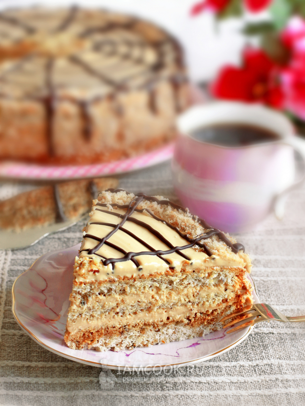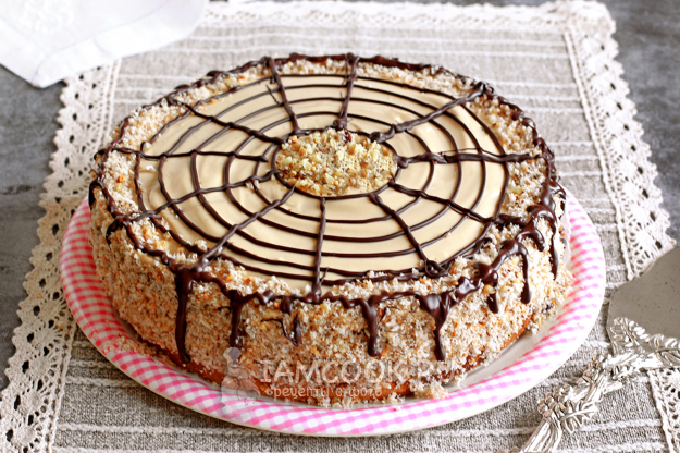 В середину насыпала дробленые орехи и нарисовала паутину растопленным шоколадом. Он мгновенно застывает на охлажденной поверхности торта и сделать с ним какие-то манипуляции не представляется возможным. Бисквитный торт с грецкими орехами и вареной сгущенкой готов.