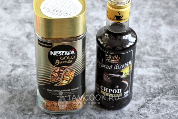 Для пропитки я взяла растворимый кофе и топинг-сироп для него же. Вы можете пропитать бисквит любым сиропом или сладкой водой. В горячей воде (150 мл) растворите чайную ложку кофе и добавьте по вкусу сироп. Можно использовать также любой ликер или коньяк, который добавляют в сладкую воду по вкусу.