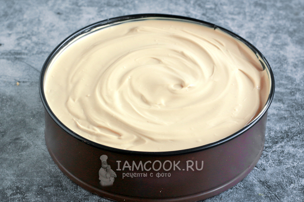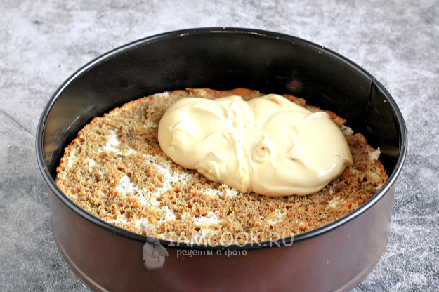 Собирайте торт в кольце, чтобы он не заваливался на бок. Разместите в кольце первый корж, пропитайте его сиропом, затем выложите крем и разровняйте. Поступите так со всеми коржами. Я пропитывала только самый толстый нижний корж.