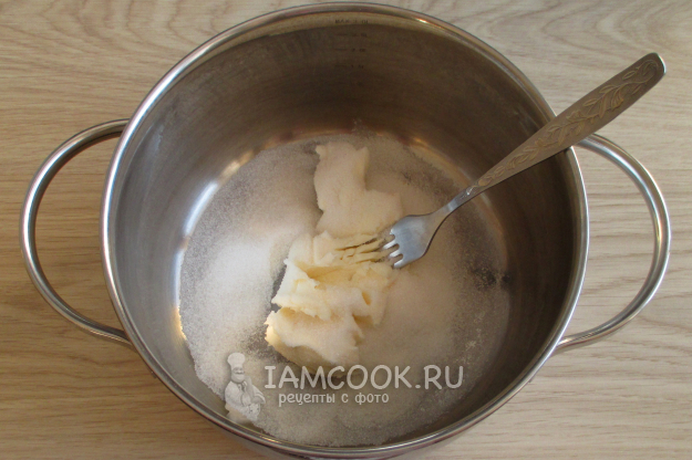 Для этого варианта песочного теста сливочное масло нужно размягчить при комнатной температуре минут 15. Разотрите масло с сахарным песком.