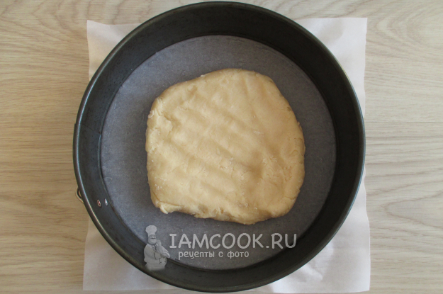 Распределите тесто по смазанной форме, сформируйте небольшие бортики. Удобно использовать разъемную форму, и ещё можно дополнительно проложить её пекарской бумагой.