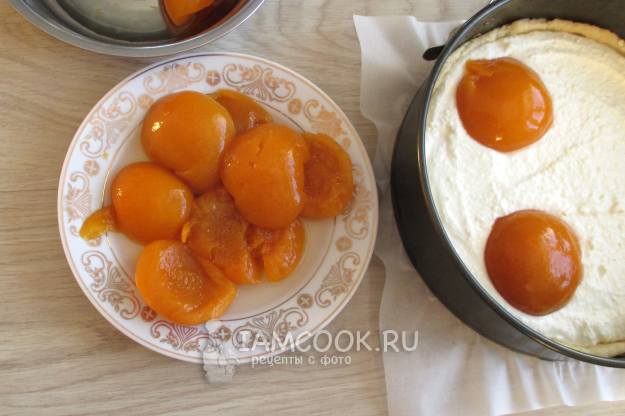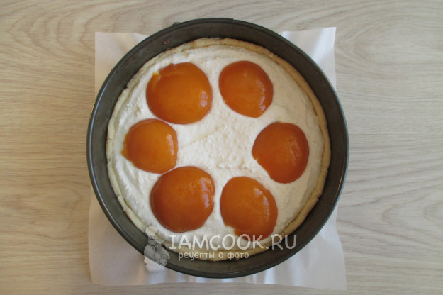 Уложите сверху половинки или ломтики консервированных персиков, немного вдавите их в начинку.