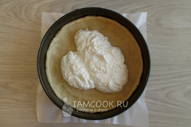 Перевалите творожную начинку в форму на тесто и выровняйте.