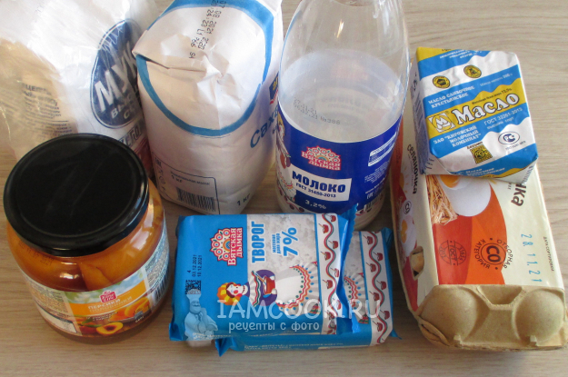 Для открытого песочного пирога с творогом и консервированным персиком подготовьте ингредиенты по списку к рецепту.