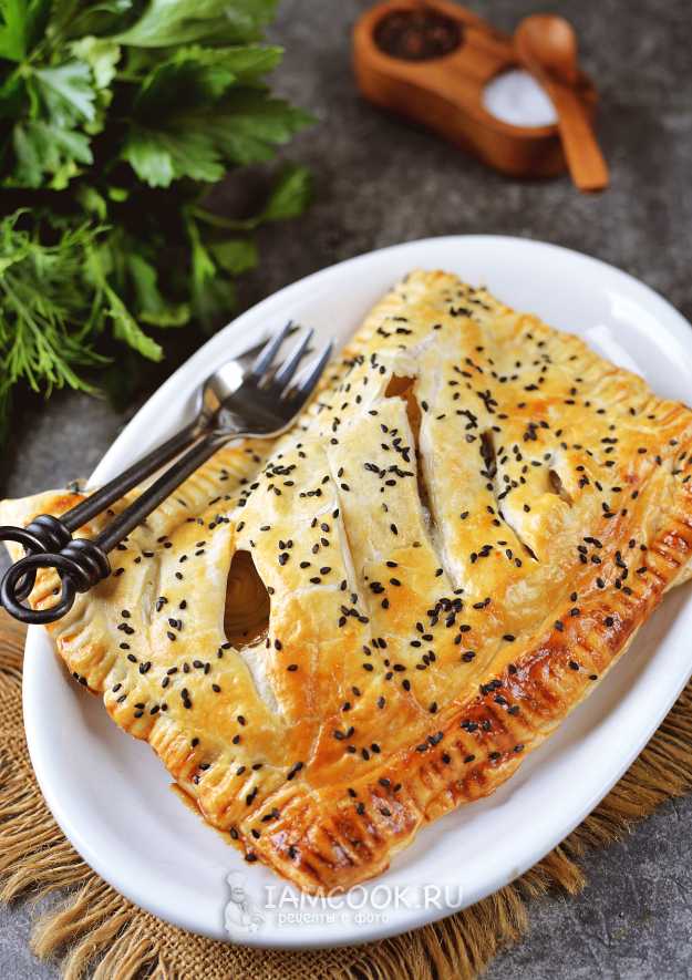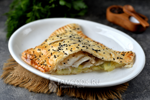 Спустя время пирог из слоеного теста с рыбой и картошкой готов! Подавайте в теплом или остывшем виде со свежими овощами и любимыми соусами.