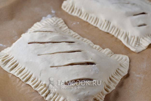 Накройте заготовку сверху куском теста, прижмите его по краям зубцами вилки, сделайте несколько глубоких надрезов ножом.