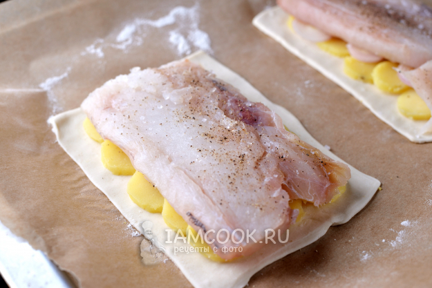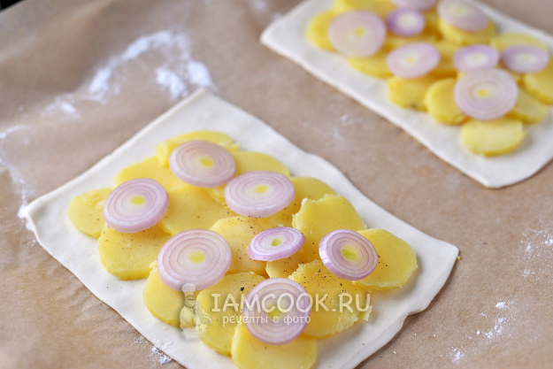 Для порционных пирогов нужно слоеное тесто раскатать приблизительно одинаковой длины и ширины с размером рыбного филе. Положите на тесто нарезанные картофель и репчатый лук. Чуть посолите и поперчите слой картофеля.