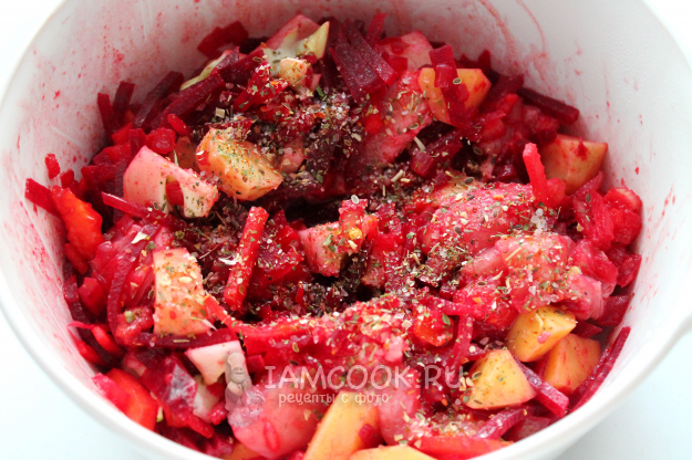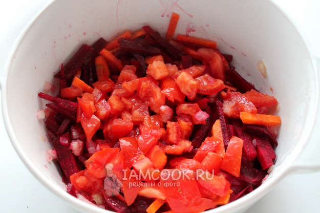 Тушим свеклу до полуготовности под крышкой (минут 7), можно долить ложку-другую воды. Потом добавляем морковь, сельдерей, помидоры. Перемешиваем и немного готовим всё вместе.