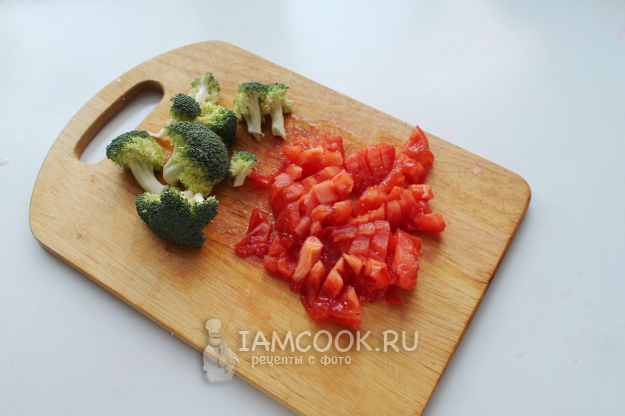 Брокколи разбираем на соцветия, а ее стебли нарезаем кубиком. Я для заправки взяла свежие помидоры, вместо них можно по желанию добавить консервированные, томатную пасту или соус.
