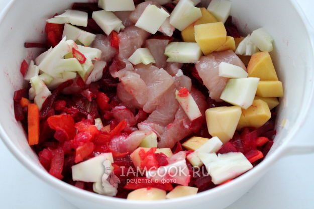 Сначала подготовим овощи: очистим те, которые подлежат чистке, промоем под струей воды. Нарезаем небольшими брусочками, куриное филе тоже режем ломтиками поперек волокон.