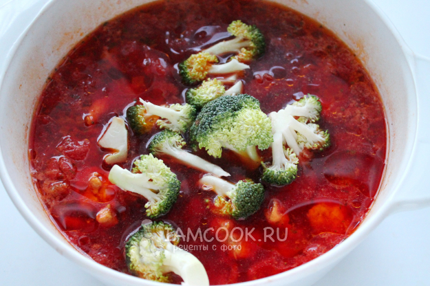 Последней в борщ идет брокколи - именно она задает тон нашему блюду своей аппетитной зеленью и мягким капустным вкусом. Готовим еще минут 5 и выключаем плиту. Даем немного настояться борщу под крышкой. Видите, каким он получился ярким и аппетитным - просто загляденье!