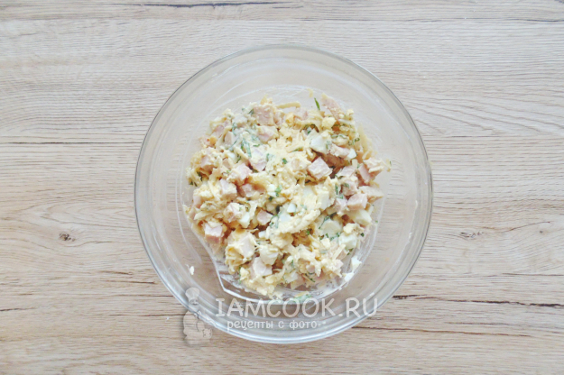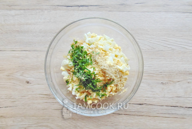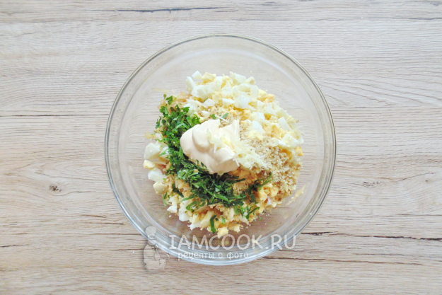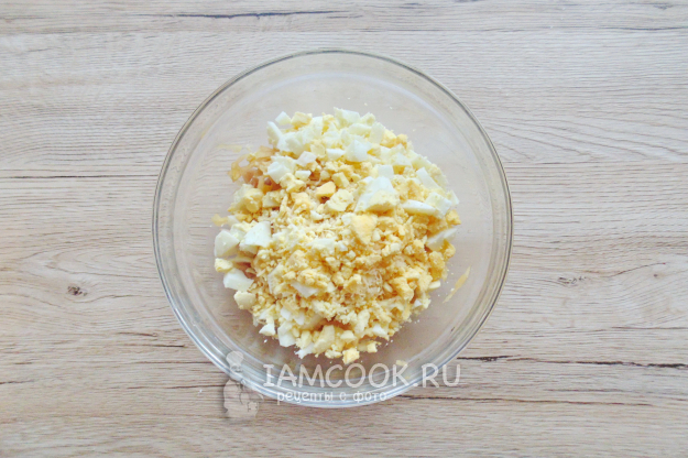 Три яйца сварите вкрутую. Обдайте холодной водой и очистите. У двух яиц отделите белки от желтков и отложите на тарелку. Одно яйцо и желтки двух других нарежьте и добавьте в салат.