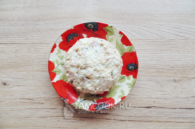 Выложите салат горкой на тарелку. Немного утрамбуйте и мокрыми руками придайте форму шара. Смажьте майонезом.