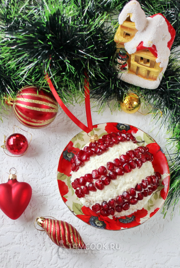 Яичный белок двух яиц, который вы отложили, натрите на терке и обсыпьте им шар. Зерна граната выложите на шар в виде полосок или любого другого узора, который вам нравится.