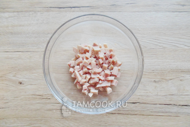 Ветчину нарежьте мелкими кубиками и выложите в миску.