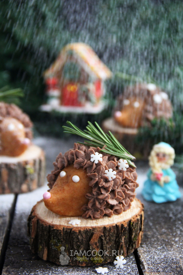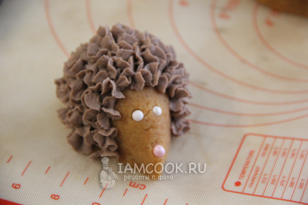 Бусинки вставить в виде глаз и носика. Отсадить крем в виде иголок. Украсить ёжиков можно в любой тематике, у нас новогодняя, поэтому ёжик несет ёлочку.