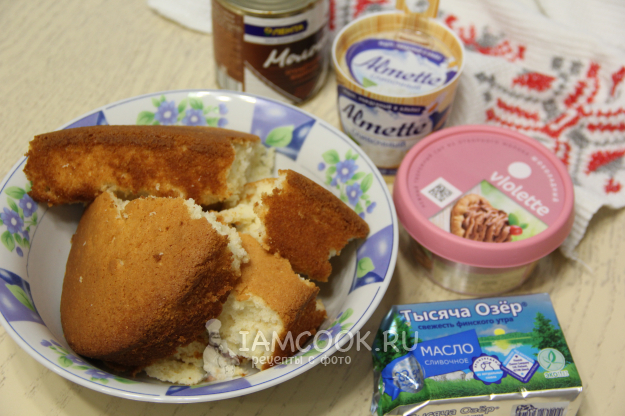 Возьмите продукты для приготовления пирожного «картошка» в виде Ёжиков. Я использовала бисквит, но можно взять печенье, подсохшие кексики и даже сахарные сухарики. Для иголок я использовала творожный шоколадный сыр, его можно купить в любом гипермаркете.