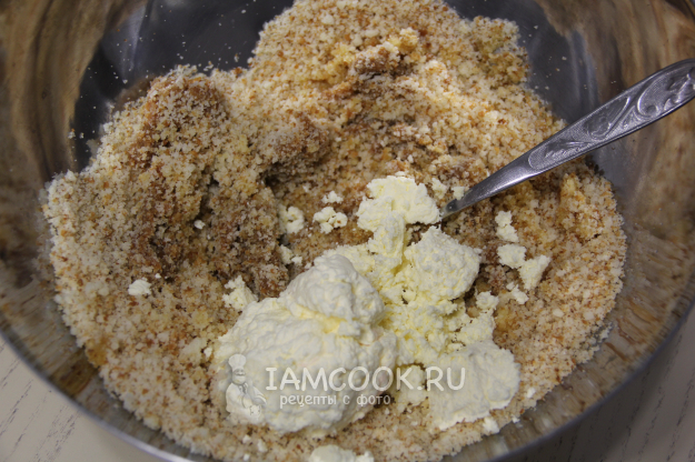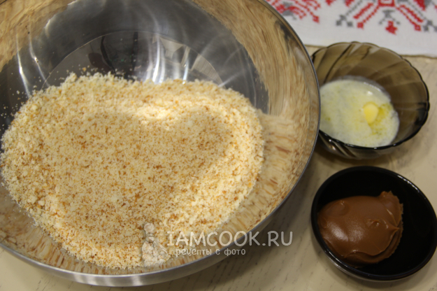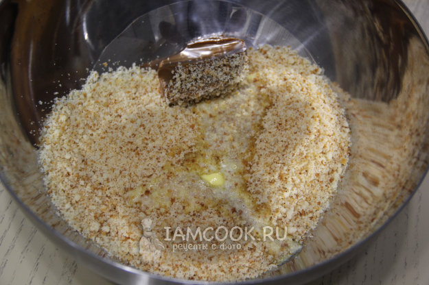 В крошку добавить растопленное масло и варёнку (вареную сгущенку).