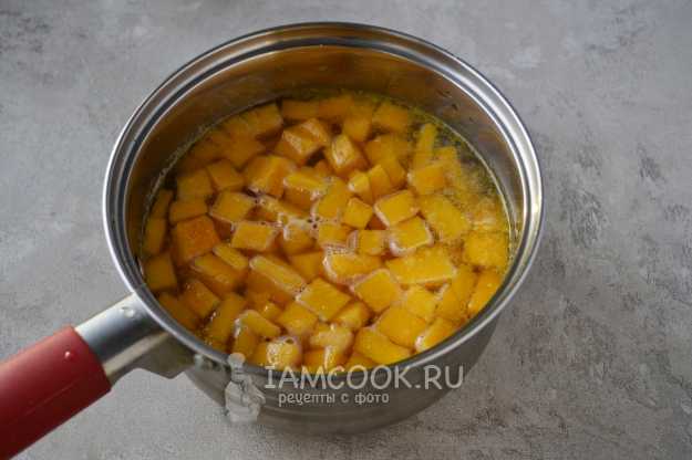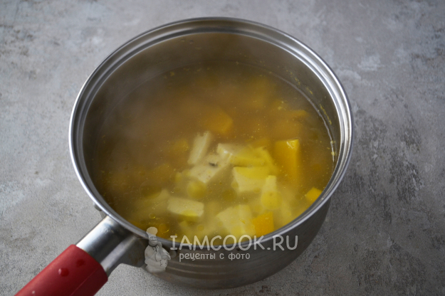 В куриный бульон отправьте нарезанные тыкву и картофель. Поставьте сотейник на огонь.