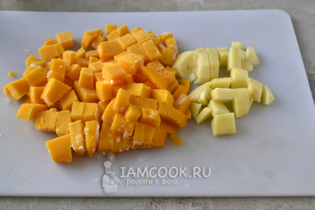 Тыкву и картофелину нарежьте произвольно, лучше небольшими кусочками, чтобы быстрее сварились.