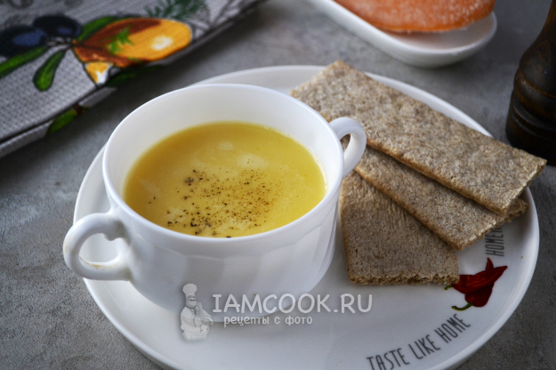 Подавайте диетический тыквенно-сырный суп-пюре с хлебцами или сухариками.