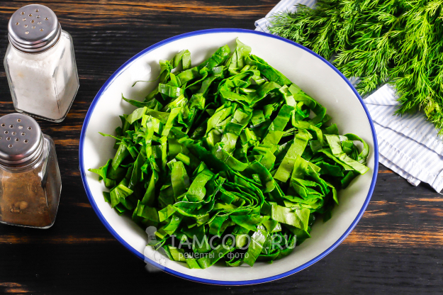 Пучки шпината разберите на листья и срежьте стебли. Каждый лист промойте в воде с обеих сторон и стряхните лишнюю влагу. Нарежьте листья лентами и выложите в глубокую емкость.